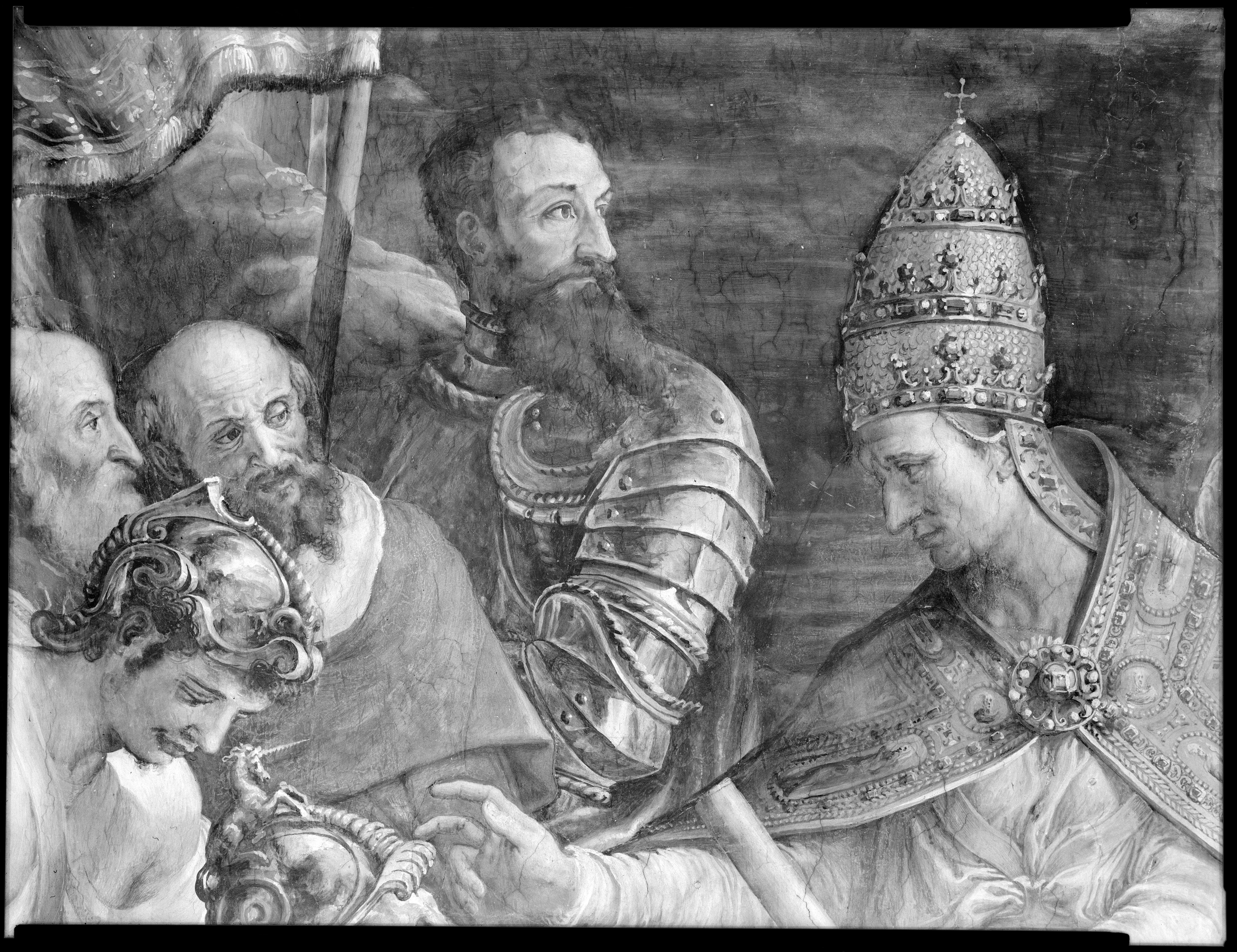 Roma - Palazzo Farnese, piano nobile, Sala dei Fasti Farnesiani, Papa Eugenio IV dà il bastone del comando a Ranuccio il Vecchio, particolare.