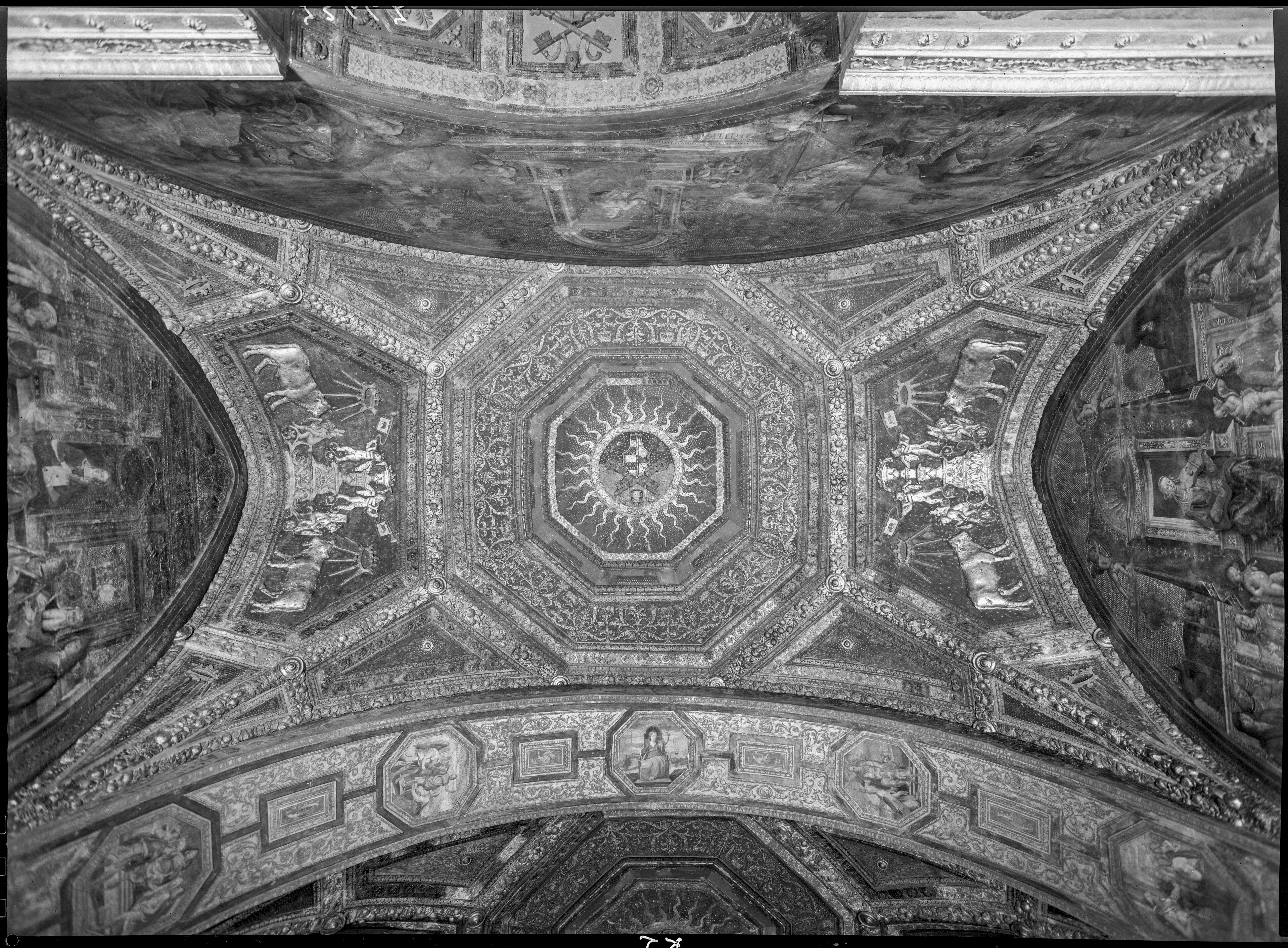 Città del Vaticano - Musei Vaticani - Appartamento Borgia, Sala delle Arti Liberali, volta, Stemma Borgia entro disco solare, Candelabre con putti, tori e corone d'Aragona